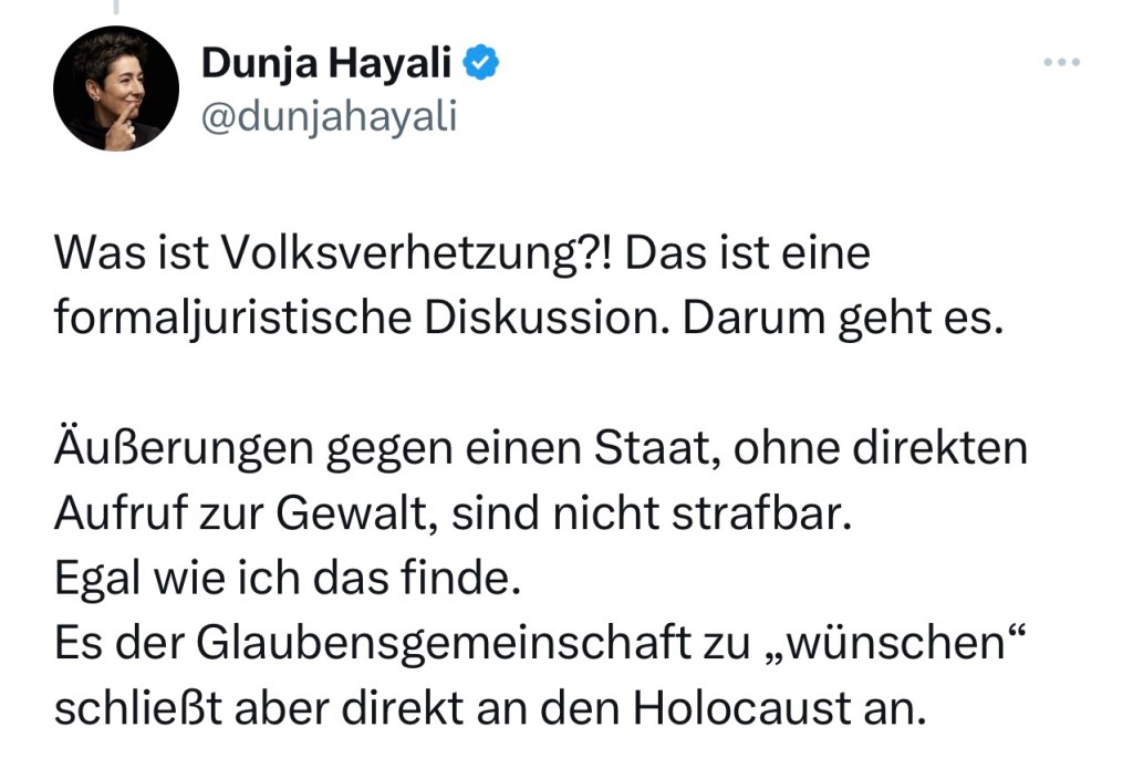 Trotz all dieser Bilder und Worte macht es für Dunja Hayali „formaljuristisch“ ein Unterschied, ob man Juden den Tod wünscht oder Israel. Durch eine solche Unterscheidung wird der Antizionismus jedoch so fahrlässig unterschätzt wie einst der Antisemitismus unterschätzt wurde.